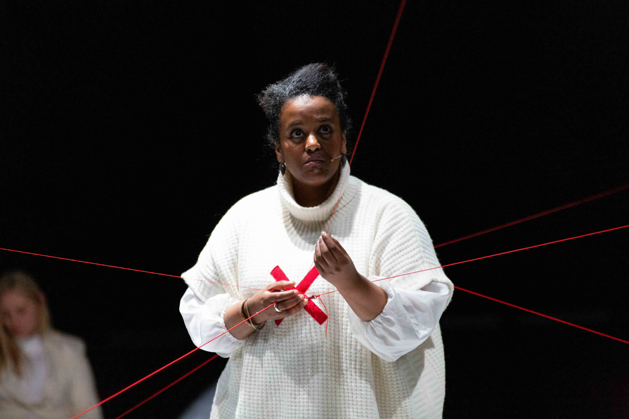 Stemmekunstner Sofia Jernberg bliver tidligt i forestillingen placeret i midten af cirklen, hvor seks røde tråde fastgjort til hendes bryst og ryg holder hende fanget. Trådene kan oplagt ses som hjertestrenge, de bånd, der knytter os til de mennesker, vi elsker. Men de virker mere som et fængsel, noget, der binder Jernberg fast. Strengeinstrumenterne akkompagnerer hendes sangpassager, der primært består af lange linjer, der gentager de samme ord, ved at slå på deres strenge med buen. Især på viola d’amoren med dens 14 metalstrenge klinger det for mig hult – som udspændte hjertestrenge, der klinger i en hul krop.