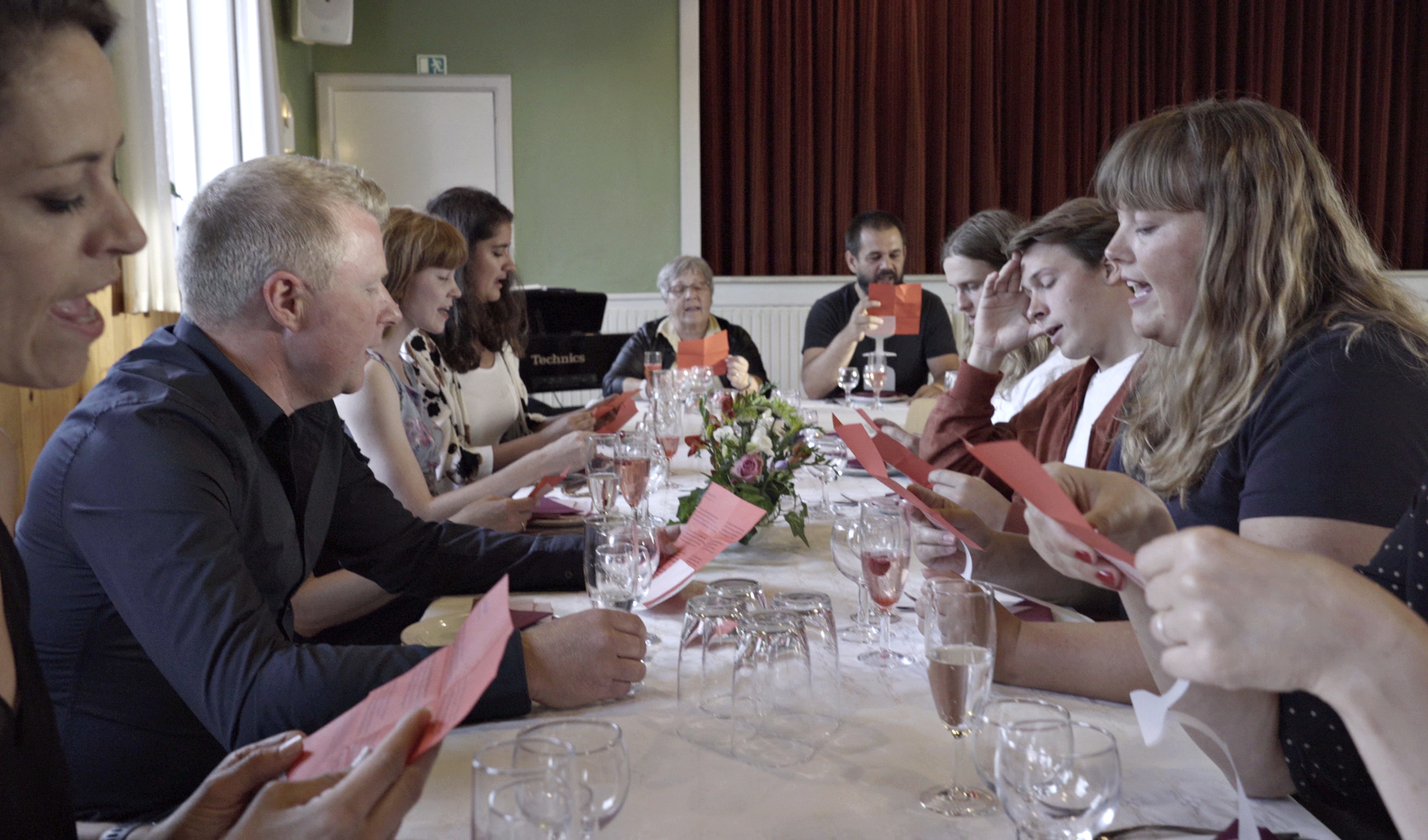 I et hjørne af festlokalet sidder en pianist, Tobias Sachse, og spiller. Når vi ikke synger, lærer vi hinanden at kende; på min højre side sidder en operationssygeplejerske, over for mig et medlem af Superheroes. Snitter bliver sendt rundt, vi skåler i både vin og kaffe og spiser lagkage. Vi er et blandet selskab, som blot venter på, at de festlige viser skal virke, ryste os sammen, uden alt for meget blotten og rødmen.