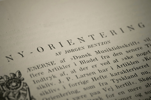Som Repræsentant for den Kreds af yngre Musikere, hvem denne Ny-Orientering ligger særligt paa Sinde, føler jeg Trang til at give en lidt mere almindelig Karakteristik af, hvad det drejer sig om, hvorved det iøvrigt er mig særlig magtpaaliggende saavel i Indstillingen som i Paavisningen af de praktiske Opgaver at faa de Forhold frem, der ud fra et dansk Synspunkt har Interesse. I ethvert kulturelt Spørgsmaal er det af største Betydning, at man fra Begyndelsen er sig sine (værdifulde) nationalt- kulturelle Særegenheder fuldt bevidst, ja en folkelig Kulturbevægelse er vistnok utænkelig, hvis ikke denne Forudsætning er i Orden. Vore kære sydlige Naboers Hang til Naivitet og Ekstremer er velkendt, og ikke mindst »neue Sachlichkeit« tiltrænger en grundig Lutring i det danske Lunes og den danske Skepsis' Skærsild, før den uden Fare kan lades over Grænsen. Desuden har Ny-Orienteringen saa mange selvstændige Kilder i tidligere dansk Aandsliv, at en Udformning paa særegent nationalt Grundlag er indiceret og nødvendig.