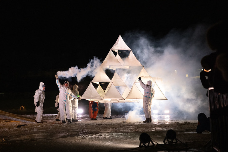 When a few thousand people clap their thick mittens in minus 30 degrees, it sounds like the softest techno. The arctic cold in Kirkenes, 400 km north of the Arctic Circle and a stone's throw from the border with Russia and Finland, steals all sounds. We are standing by an inland lake on the outskirts of the small northern Norwegian town and looking down on a makeshift stage out on the ice, where performers in white suits are building a kite. Local horn musicians play, and actors from Russia, Ukraine and Hungary slam poles into the floor and sing ritualistic chants.