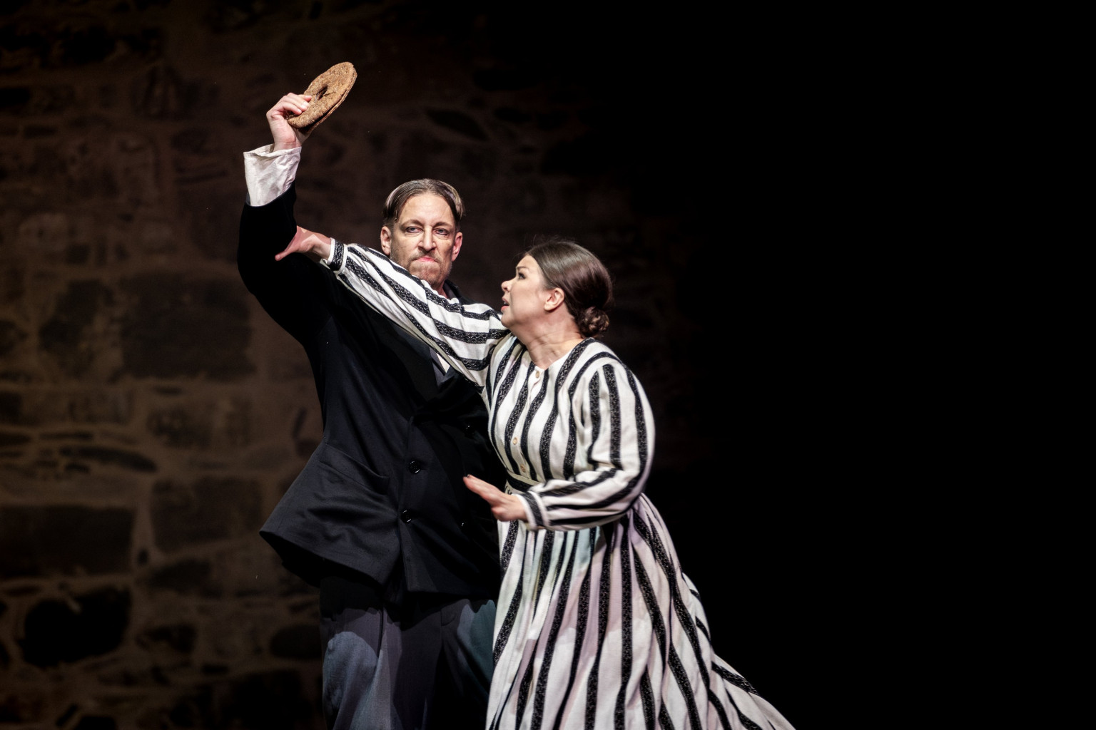 The uplifting aspect of Mikko Kouki’s staging is above all the use of light as a symbolic force and the strong character direction. A large LED-lit cross hangs horizontally, facing downward from the start, slowly lowered closer to the characters as they come under greater pressure. After the intermission between the opera’s two acts, the cross lies flat on the stage, for the characters to walk upon. A brilliant scenic effect – given the central role of the Christian cross in the drama. Paavo’s self-imposed burden is shown concretely: he begins in only a thin shirt, but gradually dons more layers – a vest, then a heavy sweater, then a coat. He is weighed down, inwardly and outwardly.