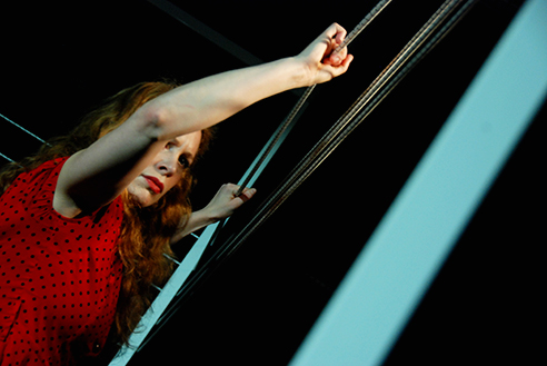 Else Marie Pades fascination af kosmos udtrykker Guldager ved på forskellig vis at interagere med scenografiens “nodesystem” - fx da hun med en streng som flitsbue skyder sin musik ud i mørket og lader den mysteriøst bevæge sig ud i universet.