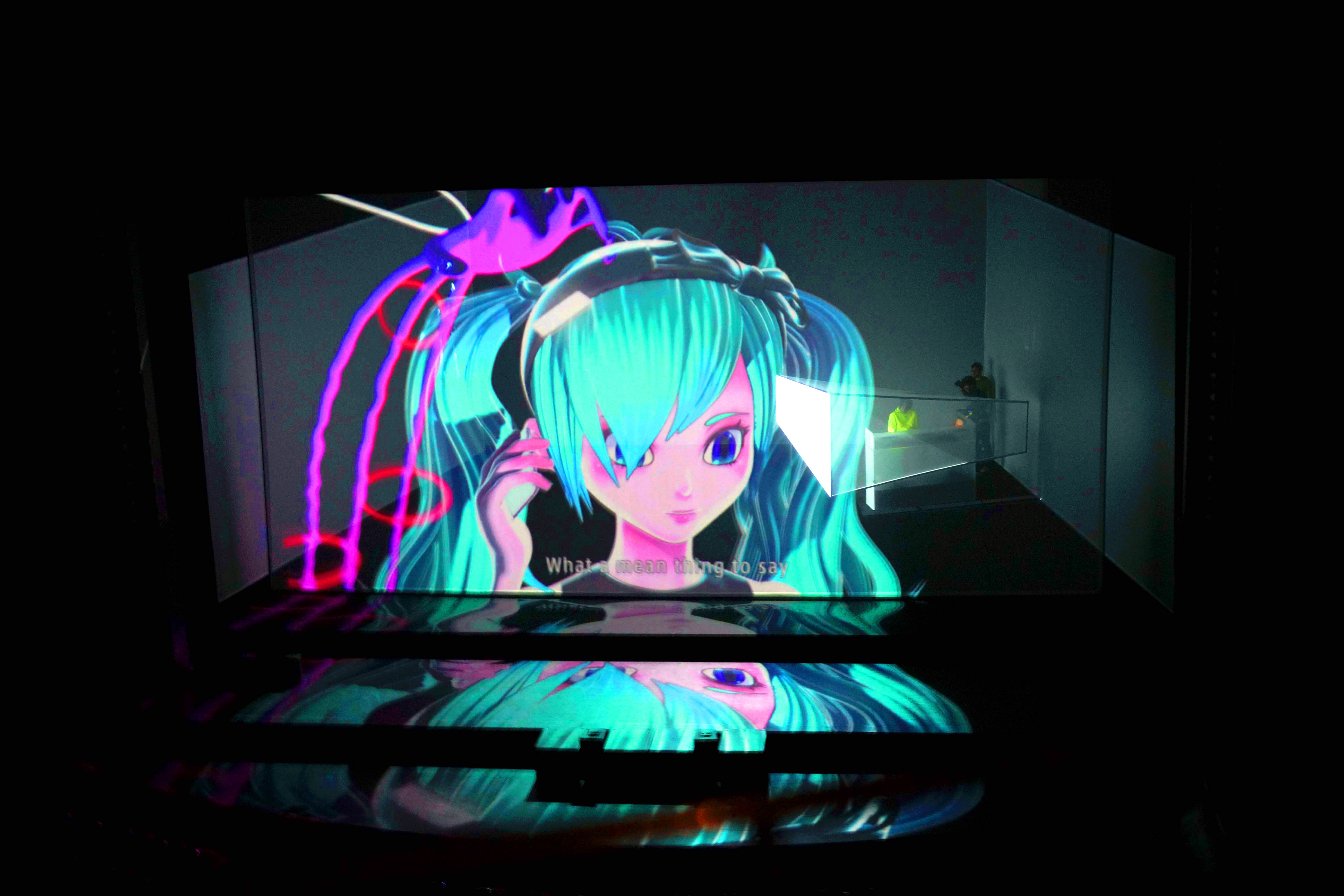 Lyset bliver dæmpet i salen og musikken begynder. Det kommer ikke fra et orkester som i en traditionel opera, men fra højtalere i et 10.2 surround-sound-system. Små dryplyde svirrer rundt om publikum i salen. Violiner blander sig ind den rytmiske puls med staccato slag. Noget der lyder som en heliumbelagt stemme synger »ahh« i en lang tone og sammenflettes med den rytmiske pulsering i rummet. Stemmen går frem og tilbage i salen som et ekkosignal. Så går tæppet går op, og fire store skærme kommer til syne. De danner en firkant rundt om Keiishiro Shibuya, som står i en gul hættetrøje på scenen, omkranset af en mindre skærmopsætning, der minder om en DJ pult. Skærmene lyser hvidt og blinker i takt med musikkens staccato. Så stopper lydens rytmiske puls brat, og at alt bliver sort. To store tegneserieøjne dukker frem på den forreste skærm, imens en talesyntese, der lyder som Apples Siri, begynder at tale; »The light shines down on an object, and it comes into existence«. Glitchede støjsignaler og violiner, som spiller opadgående skaler i hurtige løb, danner en forvirrende klangbund for den talende stemme. Hatsune Miku svæver rundt i midten af skærmen, vægtløs flydende med arme og ben hængende ned. Det lange blå hår svæver opad i to rottehaler på hver side af hendes hoved. Hun har det karakteristiske miniskirt på og en kort top med store sorte og hvide tern, som er designet af Louis Vuittons chefdesigner, Marc Jacobs. En forvrænget tegneseriestemme med en melankolsk klang taler på japansk – »everything is like that, especially us«, oversætter talesyntesen til engelsk.